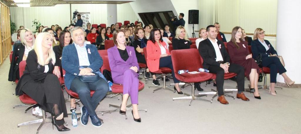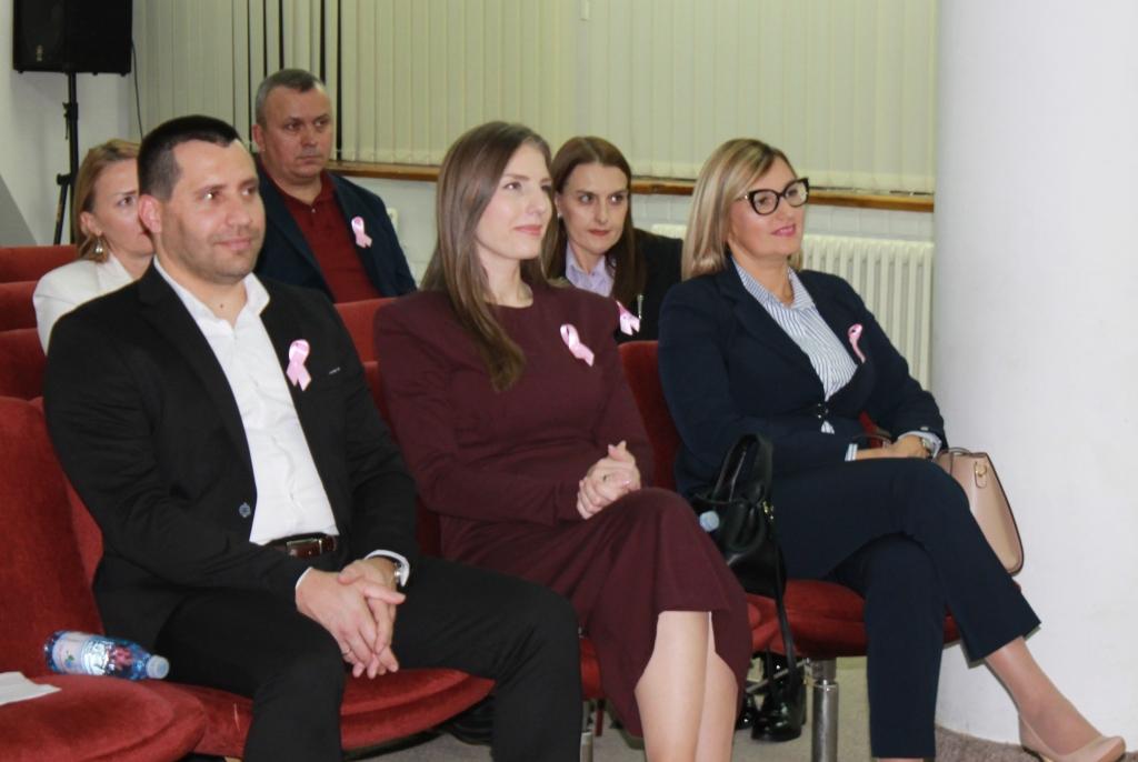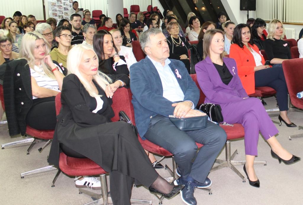 Уводна обраћања одржали су: прим. др Данијела Ђукин, директор ЈЗУ Дом здравља Бијељина, прим. др Микајло Лазић, в.д. директор ЈЗУ Болница „Свети Врачеви" Бијељина. Предавање је окупило велики број грађана који су показали интересовање за тему која се тиче свих нас, очувања здравља и важности редовних прегледа. Током вечери, стручњаци су на једноставан и разумљив начин говорили о значају раног откривања болести, о превенцији и охрабривању жена да не ћуте када примијете промјене на свом тијелу. Наши предавачи били су: др Биљана Марјановић, спец. интерне медицине, субспец. онкологије, шеф Одсјека за онкологију, др Бојан Стевић, начелник Амбуланте за специјалистичке консултације из гинекологије, др Јела Алексић, начелница Службе за радиолошку и ултразвучну дијагностику. Кроз своја излагања подијелили су драгоцјена искуства из праксе, подсјећајући присутне да свака благовремена реакција може спасити живот. Посебан акценат стављен је на улогу разговора, информисаности и повјерења између пацијента и љекара , јер превенција заиста почиње питањем, а не дијагнозом. Захваљујемо се уваженим уводничарима и предавачима на издвојеном времену, стручности и посвећености, те свим посјетиоцима који су својим присуством дали значај овој теми и показали да заједница у којој живимо препознаје важност бриге о здрављу. Посебну захвалност упућујемо Удружењу жена обољелих од карцинома дојке „ГЕА" Бијељина, које већ дуги низ година кроз несебичан рад, едукације и подршку женама широм регије доприносеборби против рака дојке. Њихов дугогодишњи ангажман показује да истинска снага лежи у заједништву, подршци и храбрости да се о здрављу говори отворено.